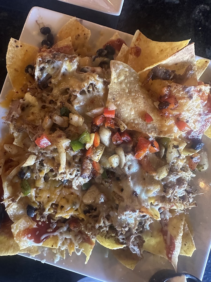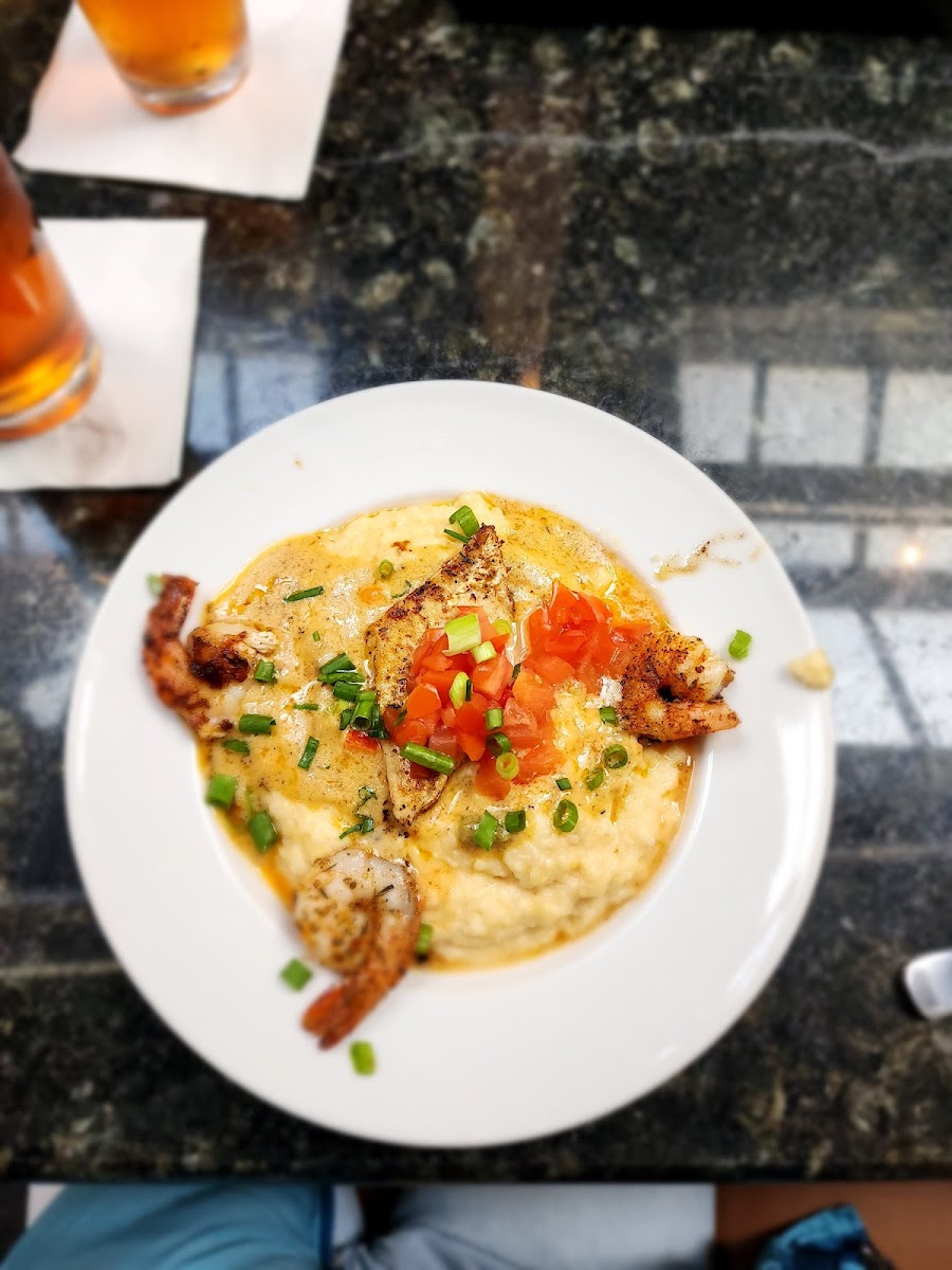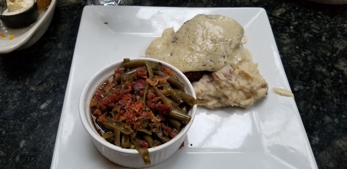 Excellent meals we shared a generous meal of Chargrilled Pork Ribeye topped with a spiced brown sugar, walnut and golden raisin compound butter, with sweet potato hash and collard greens. No extra plate charge as we are seniors and traveling so no to go possibilities. Good service. A tad noisy but conversation was very possible. Prices were very reasonable for portion size.